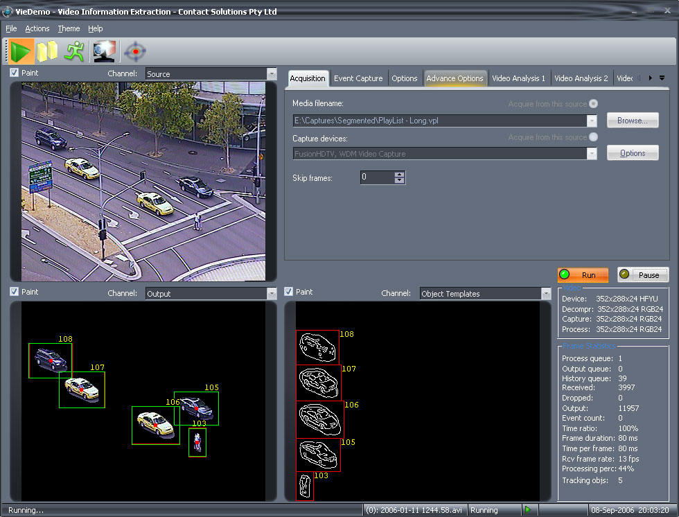 - Pre-process frames to adjust scale, remove colour, de-interlace, or comply with other settings such as rate of analysis and recording.